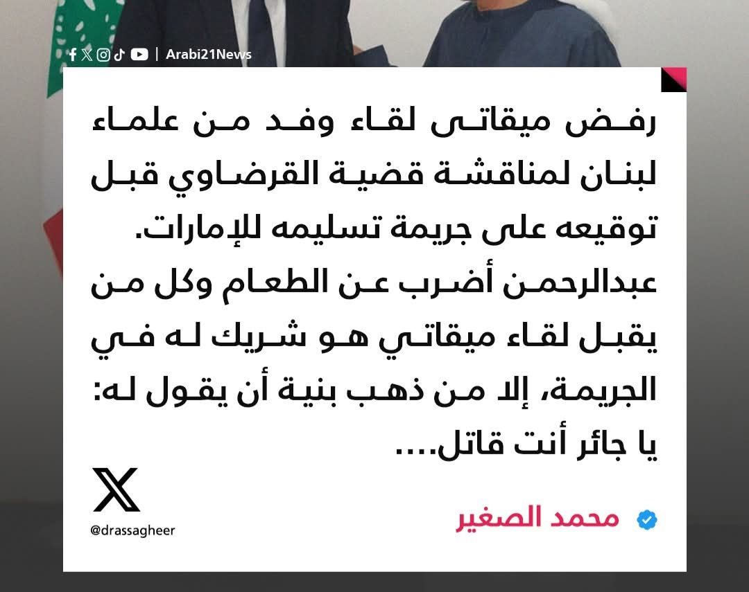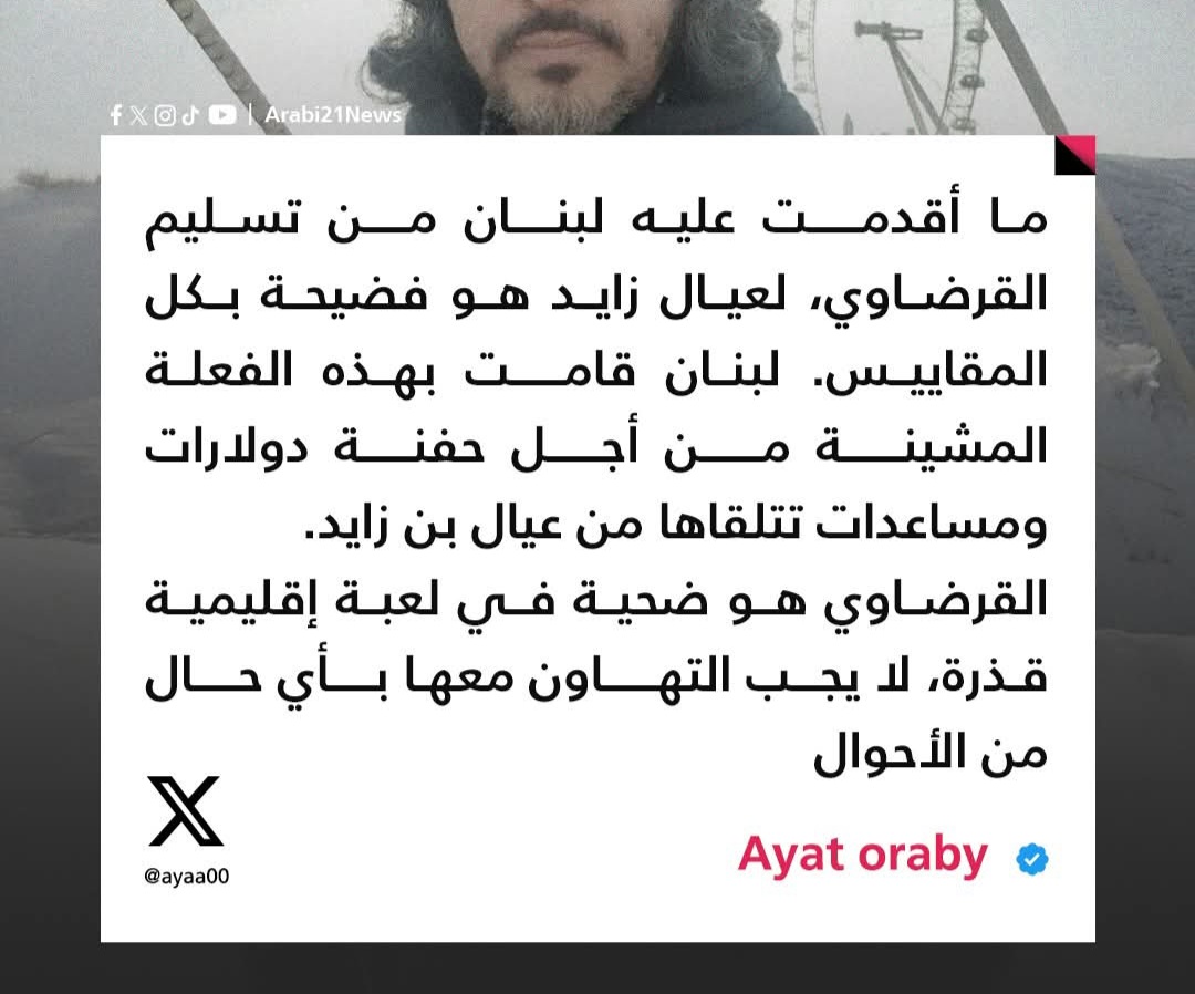 متابعات _ انباء السودان _ بعد ترحيل الشاعر والناشط المصري عبدالرحمن يوسف القرضاوي من لبنان إلى الإمارات، تصاعدت الانتقادات من قبل النشطاء على مواقع التواصل الاجتماعي الذين دعوا لملاحقة رئيس الوزراء اللبناني نجيب ميقاتي بسبب اتخاذه هذا القرار. يأتي ذلك في وقت تحذر فيه المنظمات الحقوقية من خطر ترحيل القرضاوي إلى الإمارات أو مصر، حيث يعتبران من الدول التي تواجه فيها حقوق الإنسان ضغوطات شديدة. ورغم أن القرضاوي معروف بمواقفه المعارضة للأنظمة في تلك الدول، إلا أن ترحيله أثار قلقاً كبيراً في الأوساط الحقوقية والسياسية.