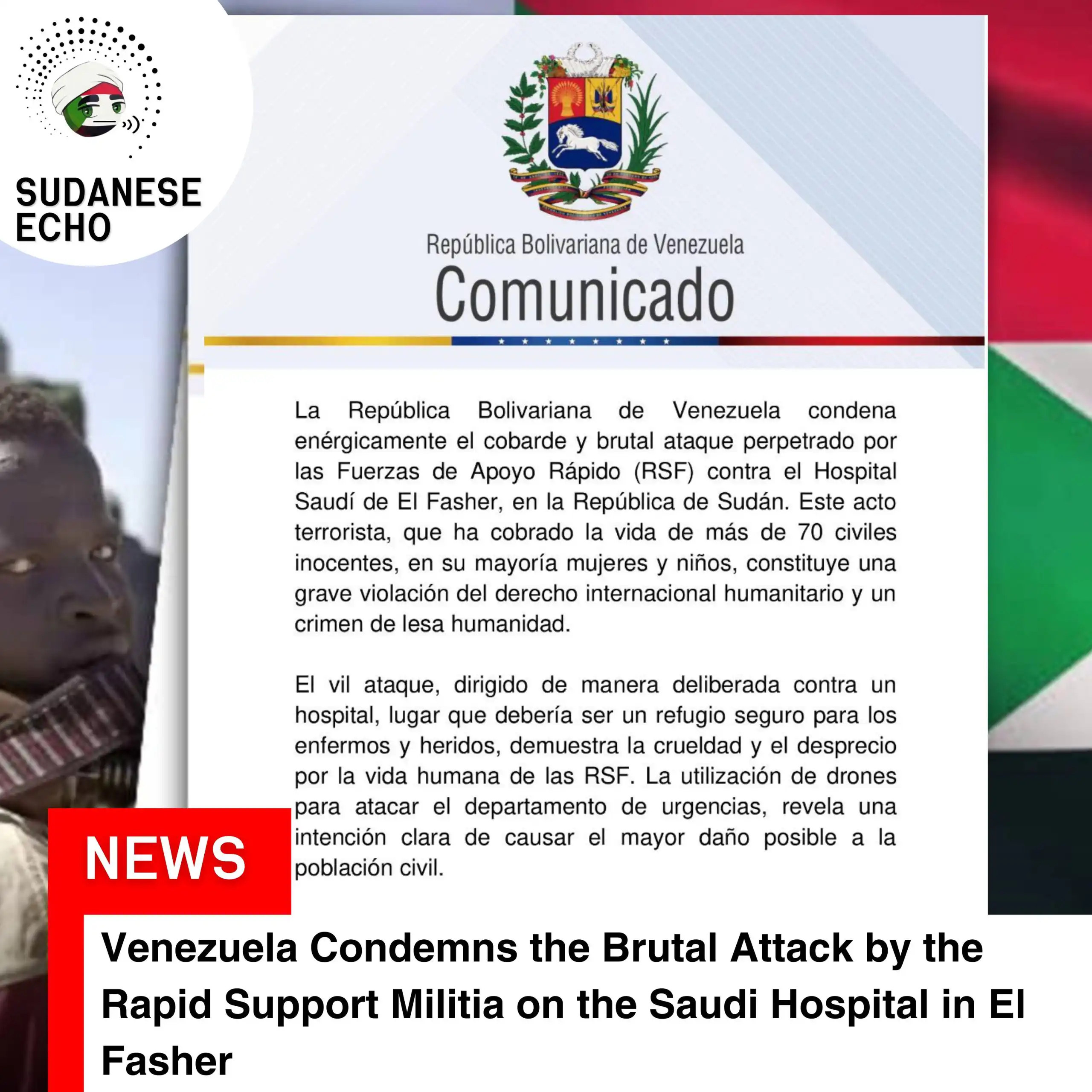 “تدين جمهورية فنزويلا البوليفارية بأشد العبارات الهجوم الجبان والوحشي الذي نفذته مليشيا الدعم السريع (الجنجويد) على المستشفى السعودي في مدينة الفاشر بجمهورية السودان. هذا العمل الإرهابي، الذي أودى بحياة أكثر من 70 مدنيًا بريئًا، معظمهم من النساء والأطفال، يمثل انتهاكًا جسيمًا للقانون الدولي الإنساني وجريمة ضد الإنسانية.
