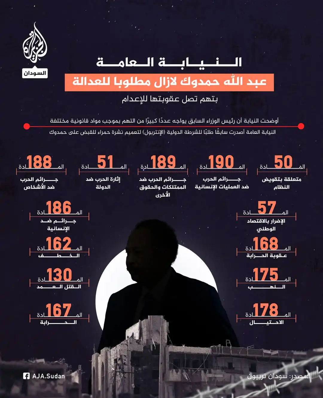 النيابة العامة تؤكد أن عبد الله حمدوك لا يزال مطلوبًا للعدالة… إليك التفاصيل بالأحكام انباء السودان اخبار بواسطة انباء السودان آخر تحديث يناير 30, 2025 0 شارك متابعات _ انباء السودان _ النيابة العامة تؤكد أن عبد الله حمدوك لا يزال مطلوبًا للعدالة بتهم تتعلق بالأحداث الأخيرة في البلاد، مشيرة إلى أن التحقيقات مستمرة لضمان محاسبة كل من شارك في الأحداث. المزيد من المشاركات السجن المؤبد لمتعاون مع الدعم بمحلية مروي فبراير 12, 2026 تزايد عدد الضحايا في كارثة ولاية نهر النيل فبراير 12, 2026 مصر تنتفض بقمة الاتحاد الافريقي فبراير 12, 2026 اضغط هنا للانضمام الى مجموعاتنا في واتساب #حمدوكاحكاممطالبة 0 شارك