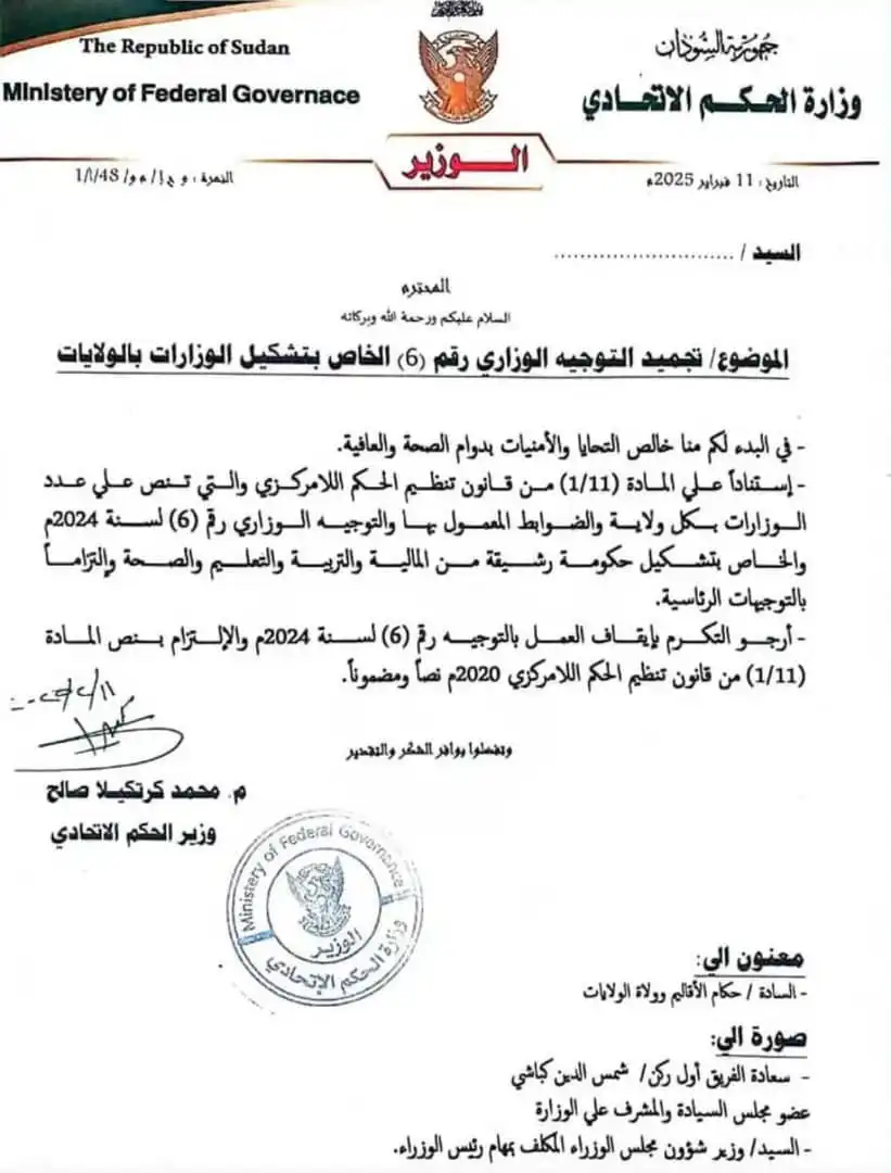 متابعات _ انباء السودان _ اصدر وزير الحكم الاتحادي مهندس محمد كرتكيلا صالح قرارا بتجميد التوجيه الوزاري رقم (6) الخاص بتشكيل ودمج الوزارات بالولايات ، وجاء القرار إستناداً علي المادة (1/11) من قانون تنظيم الحكم اللامركزي والتي تنص علي عدد الوزارات بكل ولاية والضوابط المعمول بها والتوجيه الوزاري رقم (6) لسنة 2024م والخاص بتشكيل حكومة رشيقة من المالية والتربية والتعليم والصحة والتزاماً بالتوجيهات الرئاسية.