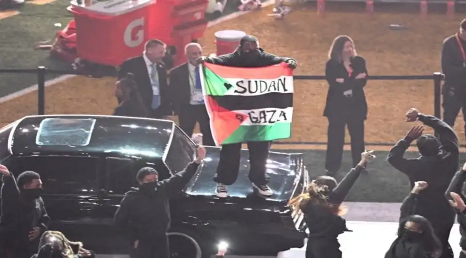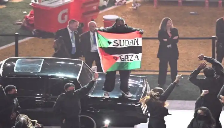 شهدت مباراة السوبر بول، التي أقيمت أمس في استاد “سيزرز سوبر دوم” بمدينة نيو أورليانز الامريكية،  حدثًا غير متوقع خلال عرض الاستراحة، حيث قام أحد المحتجين برفع علمي السودان وفلسطين على خشبة المسرح أثناء أداء الفنان كيندريك لامار.