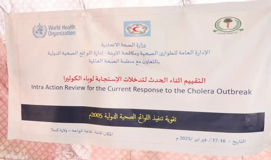 شرعت وزارة الصحة الإتحادية ممثلة في الإدارة العامة للطوارئ الصحية ومكافحة الاوبئة -إدارة اللوائح الصحية الدولية- بالتعاون مع منظمة الصحة العالمية، في تقييم تدخلات الاستجابة لوباء الكوليرا (التقييم أثناء الحدث)عبر تقوية اللوائح الصحية الدولية 2025م.