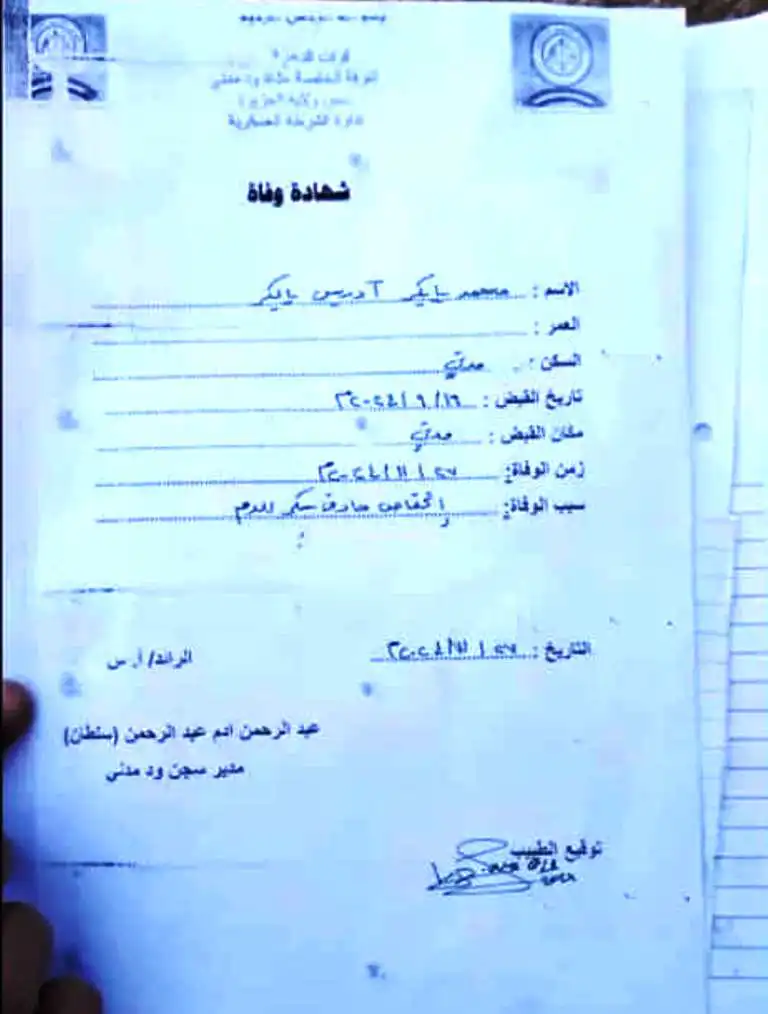 متابعات _ انباء السودان _ في مأساة إنسانية قاسية، اكتشفت أسرة محمد بابكر شهادة وفاته بعد عامين من الغياب، حيث تم الإعلان عن وفاته في 27 نوفمبر 2024 نتيجة لانخفاض حاد في مستوى سكر الدم، في واقعة لم يتضح بعد ملابساتها. الشهادة، التي نشرتها صفحة على فيسبوك تؤيد القوات المسلحة، أثارت تساؤلات حول ظروف وفاة محمد الذي تم اعتقاله في يونيو 2024 في مدينة مدني.