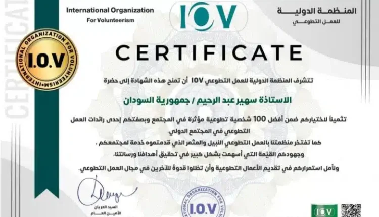اختارت المنظمة الدولية للعمل التطوعي IOV الصحفية السودانية سهير عبدالرحيم كأفضل شخصية نسائية ذات تأثير في العمل التطوعي ضمن قائمة تضم 100 امرأة من الوطن العربي. جاء الإعلان عن هذا الاختيار خلال احتفالية نظمتها المنظمة أمس في واشنطن، حيث تم تكريم الصحفية سهير عبدالرحيم، رئيس منظمة خطوة عشم، بالإضافة إلى الأستاذة عايدة السيد عبدالله، الأمين العام لجمعية الهلال الأحمر السوداني.