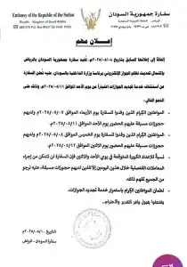 اعلان مهم من سفارة السودان بالرياض