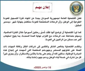 ويأتي هذا الإعلان في إطار جهود الحكومة السودانية لتسهيل عودة المواطنين الراغبين في العودة الطوعية، وضمان تنظيم الرحلات بطريقة تضمن راحتهم وسلامتهم.