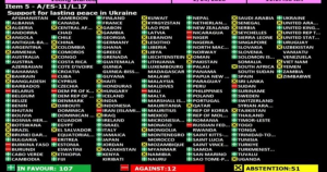 متابعات – أنباء السودان – أقرت الجمعية العامة للأمم المتحدة قرارًا يدعو لدعم مسار السلام في أوكرانيا خلال جلسة 28 فبراير، وحصل على تأييد 107 دول، مقابل اعتراض 12 وامتناع 51 عن التصويت.
